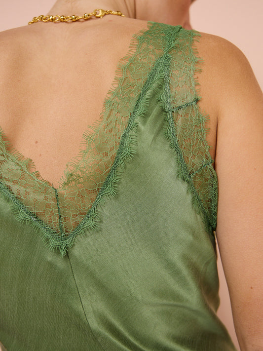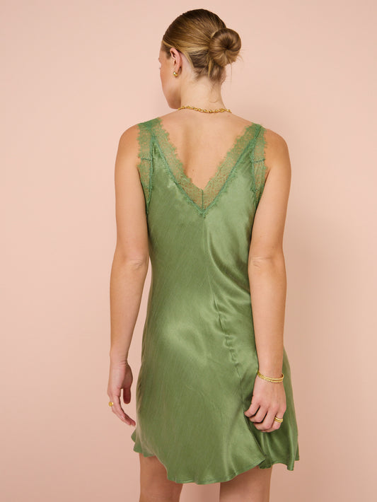 Featuring a bias-cut shape, this flirty mini dress boasts lace details at the bust, and a subtle sheen that catches the light.