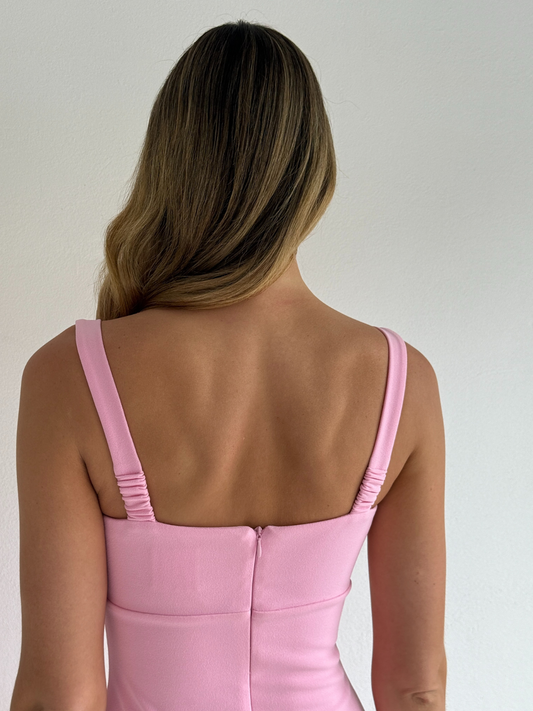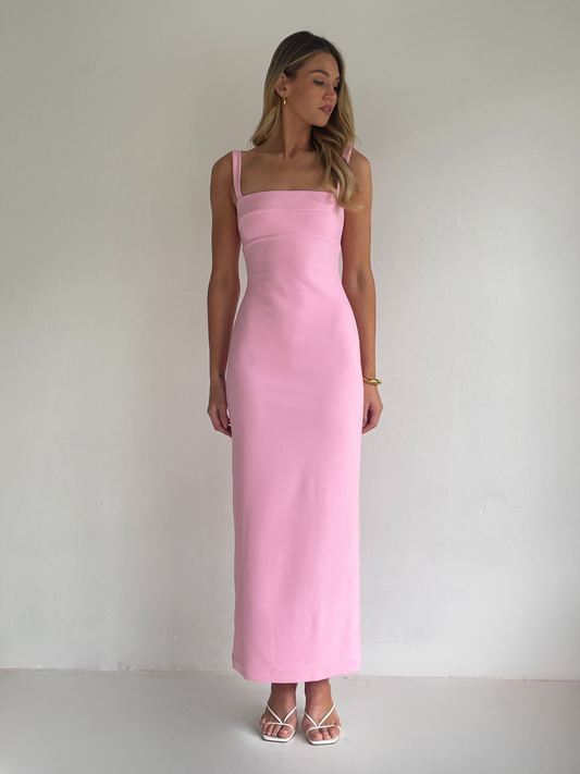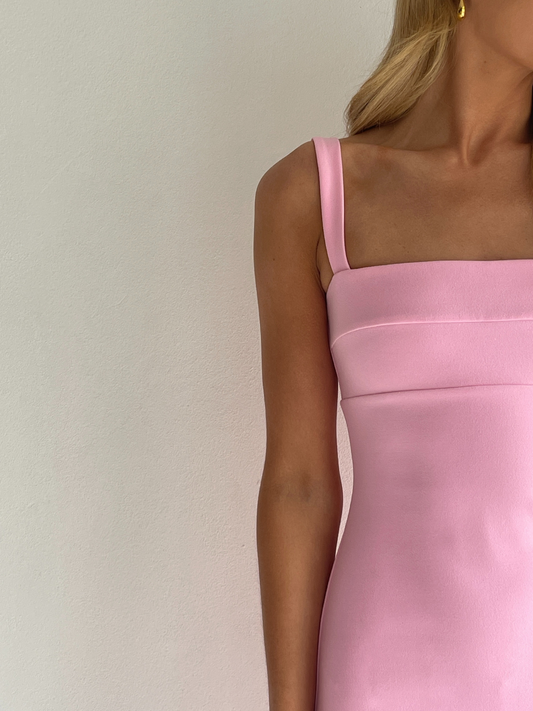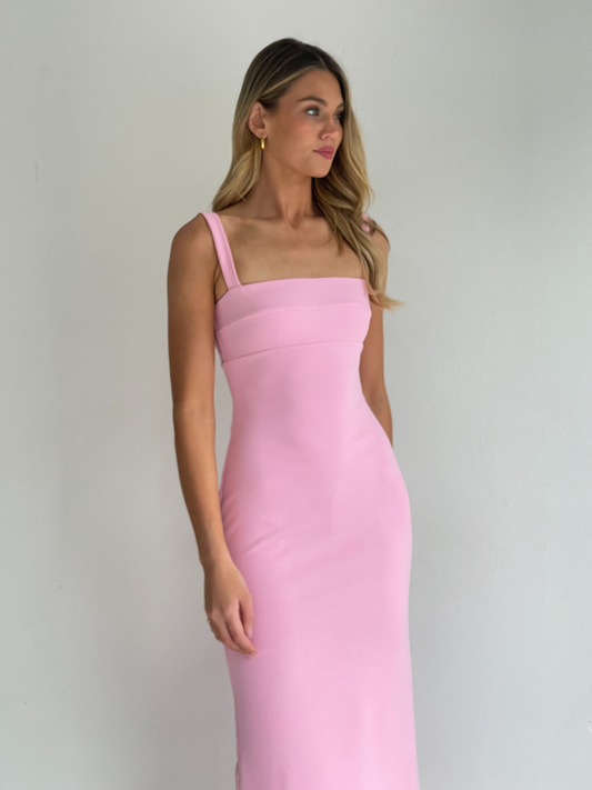 The Ari Midi Dress in Pink is made from a thick stretch crepe. Fully lined with centre back zip, fitted bust panel, shoulder straps and centre back skirt split.