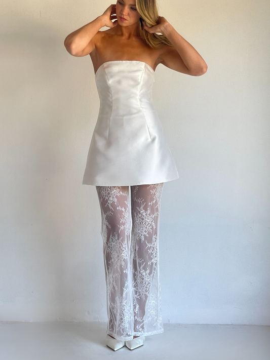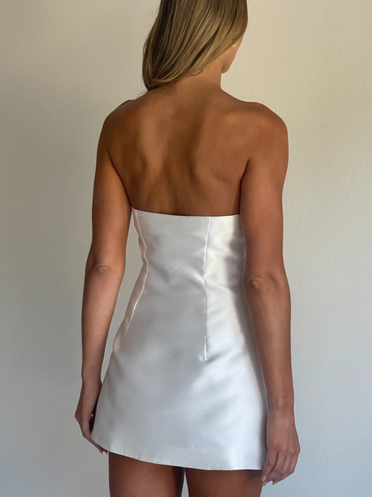 The Arley Celeste Mini Dress in Ivory is made from a structured high sheen Mikado fabric with boning at bodice and an Aline skirt for a flattering shape and fit.