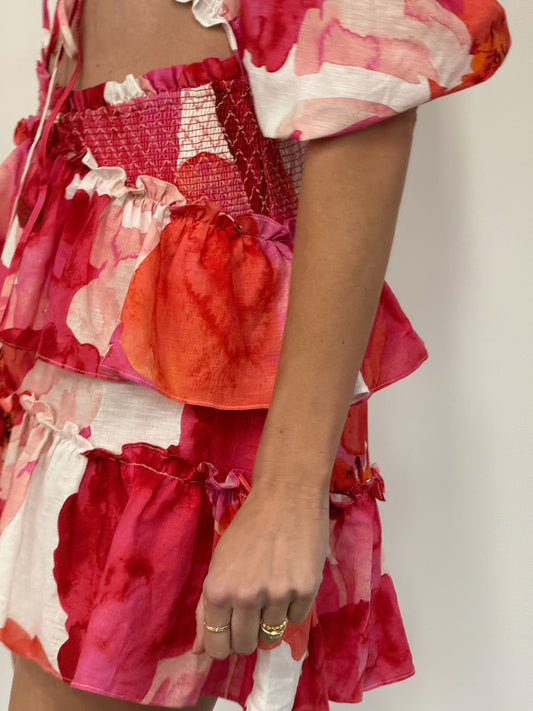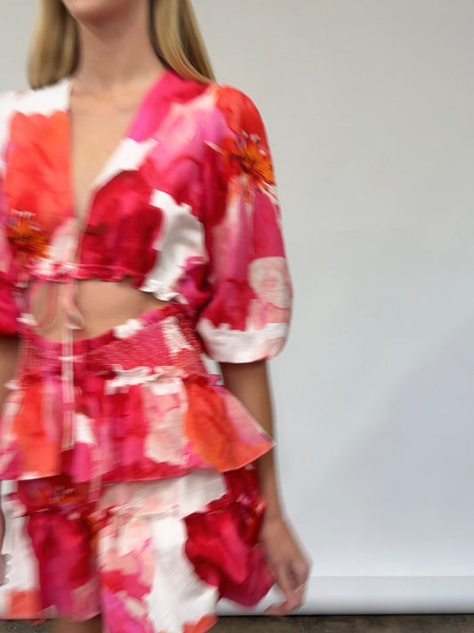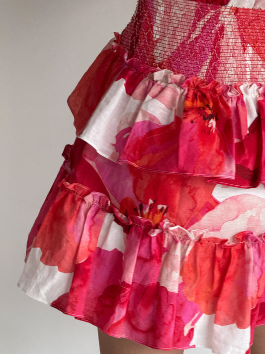 Our exclusive print pairs perfectly with this fun, flirty ruffle dress. The adjustable tie at the bodice allows for movement and comfortability.