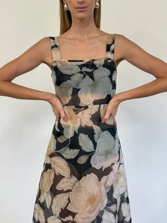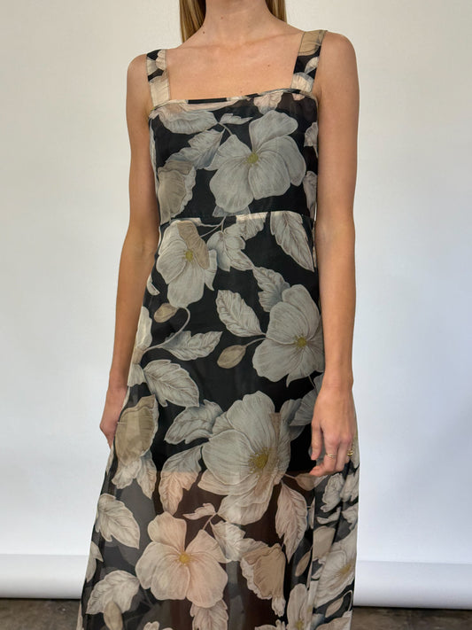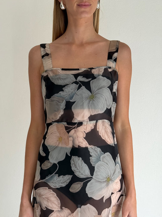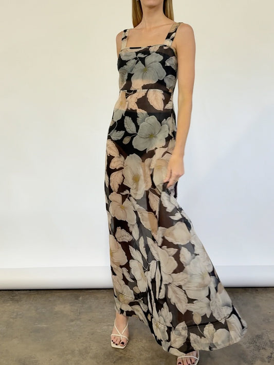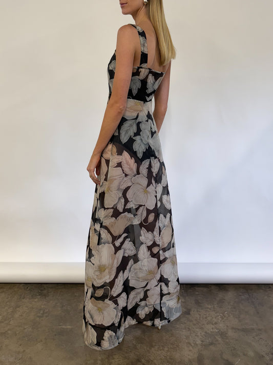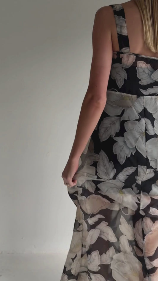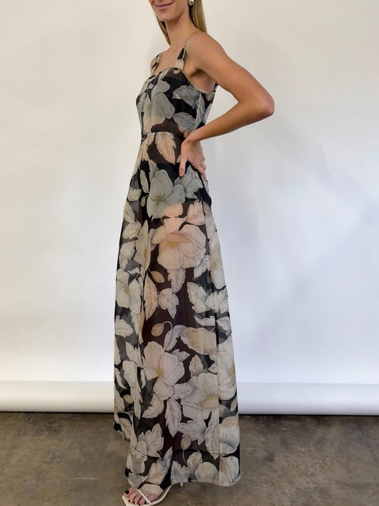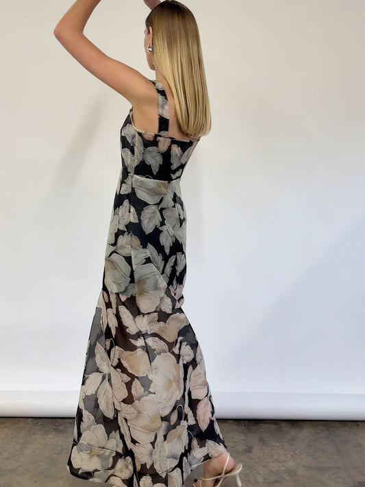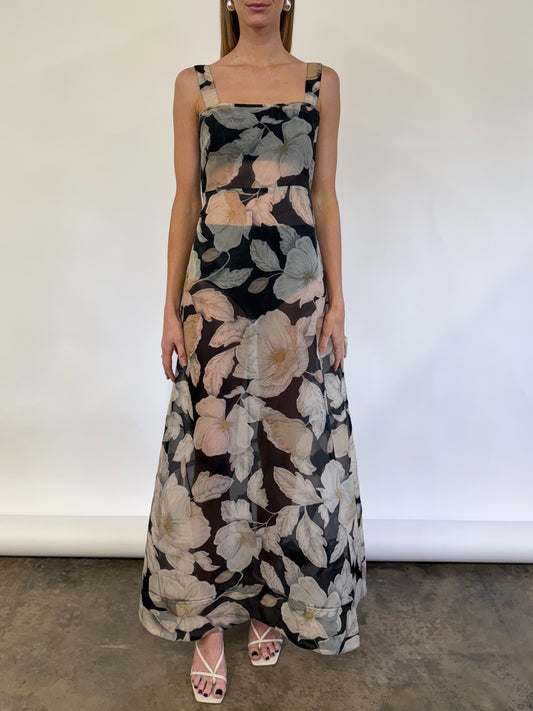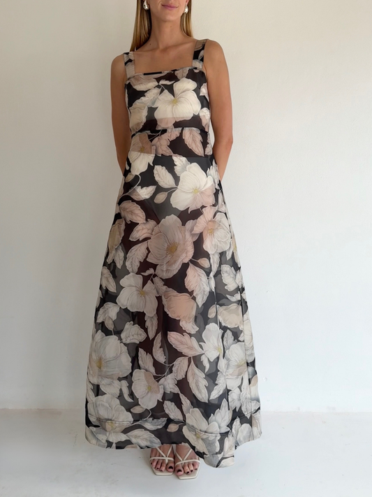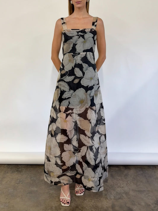 The Goldie Maxi Dress in Noir Bloom features a contemporary silhouette in a light weight soft touch organza.