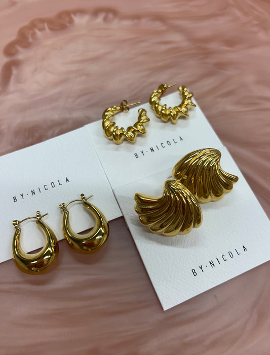 The Bianca earrings from By Nicola are made from stainless steel and 18k gold plated. Waterproof, tarnish resistant and come packaged in a small gift pouch.