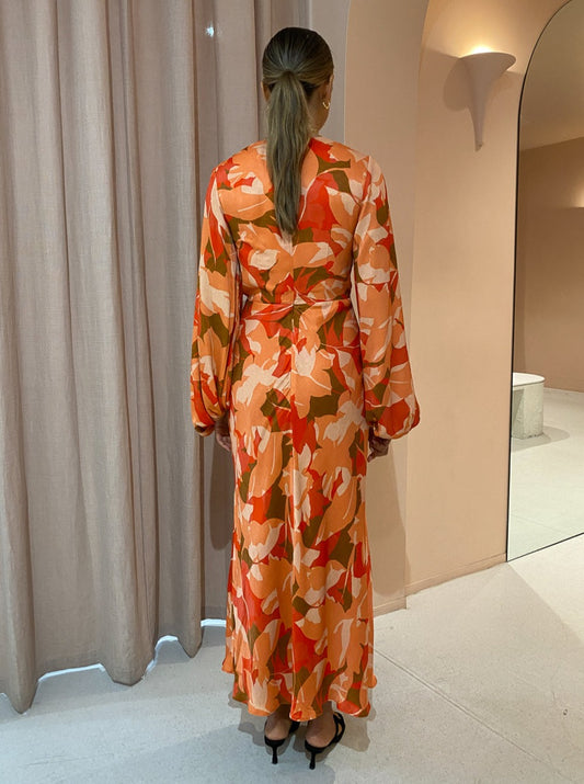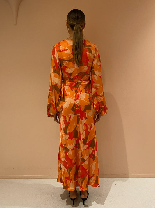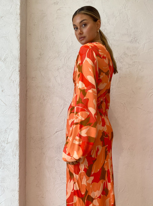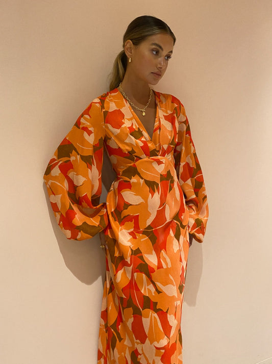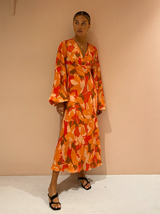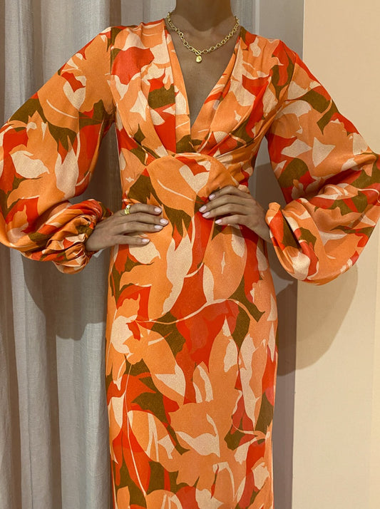Crafted from a silky fabrication in a warm abstract print, this midi dress features a V neckline, large billowing sleeves with elasticated cuffs and elegant ruching at the chest.