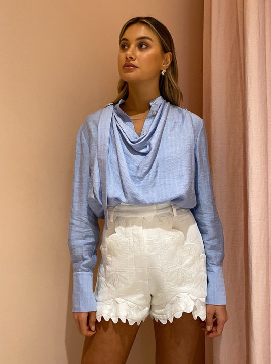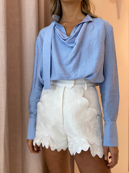 Delicately crafted from a cotton linen broderie anglaise with scallop detailing across the hem and waist, we love these ultra feminine shorts for year round dressing.