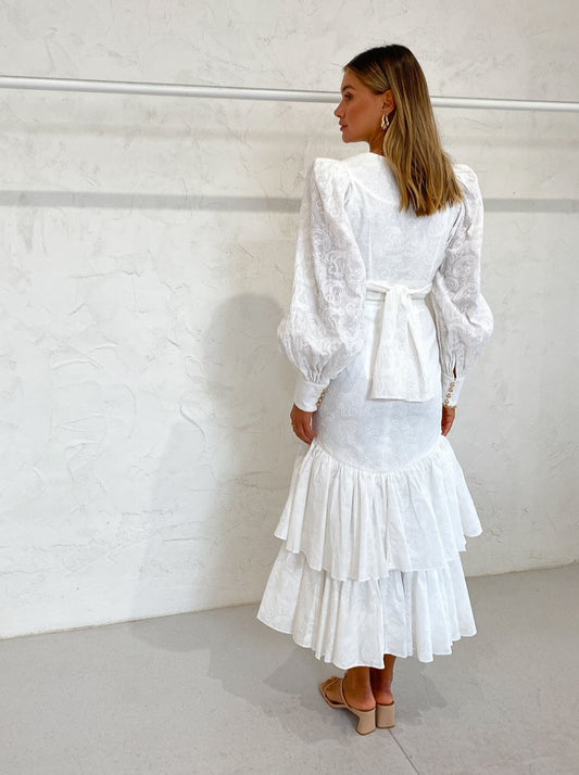 Designed in an embroidered cotton fabrication, this feminine silhouette showcases a fitted waist with a double tiered hemline.