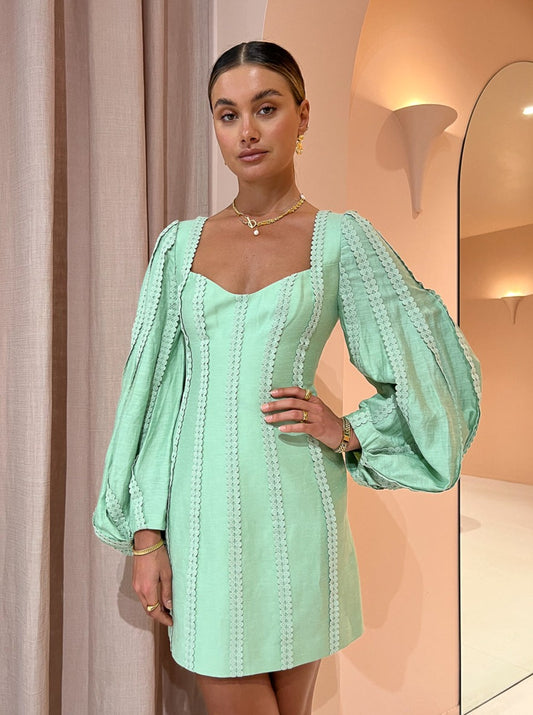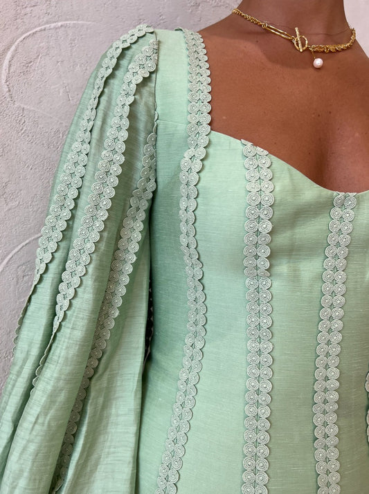 Acler infuses artful silhouettes to our occasion wardrobe with the Duxbury Dress in Foam Green.