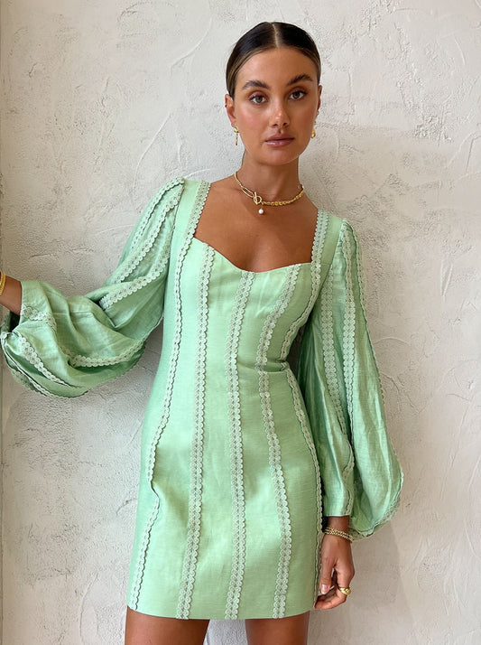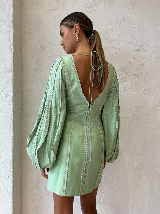 Delicately crafted from a luxurious linen blend this mini dress is designed to flatter against the body. Featuring large blouson sleeves, a sweetheart neckline, a plunging backline and centre back tie.