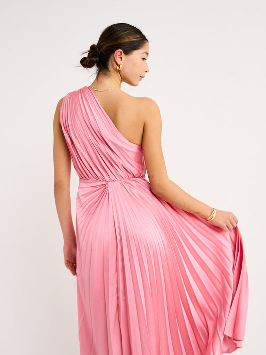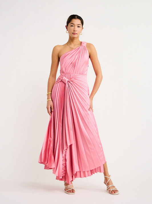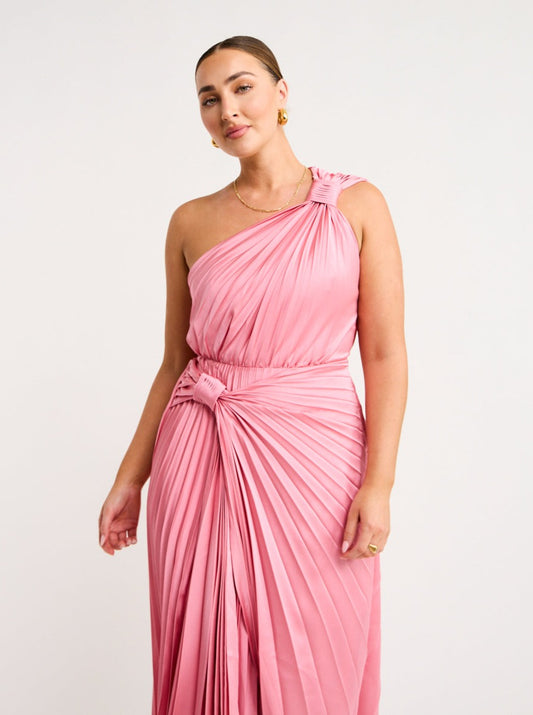 Combining enigmatic geometric pleats with a timeless one shoulder design, this midi invites endless compliments. The feature knots at the shoulder and waist create an eye-catching aesthetic that cascades into a full flowing, asymmetric skirt.