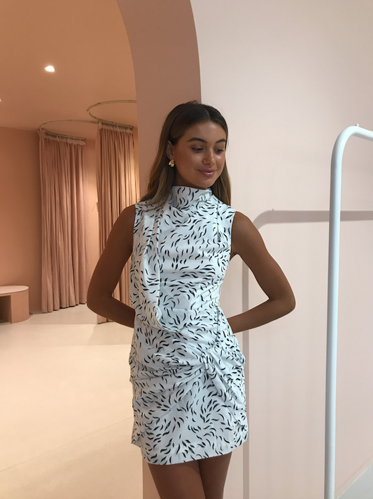Acler's Jasper Dress in lustrous fabric is a simple but elegant mini dress featuring drape and twist detail to flatter the female silhouette. This trans-seasonal mini dress is a must-have.