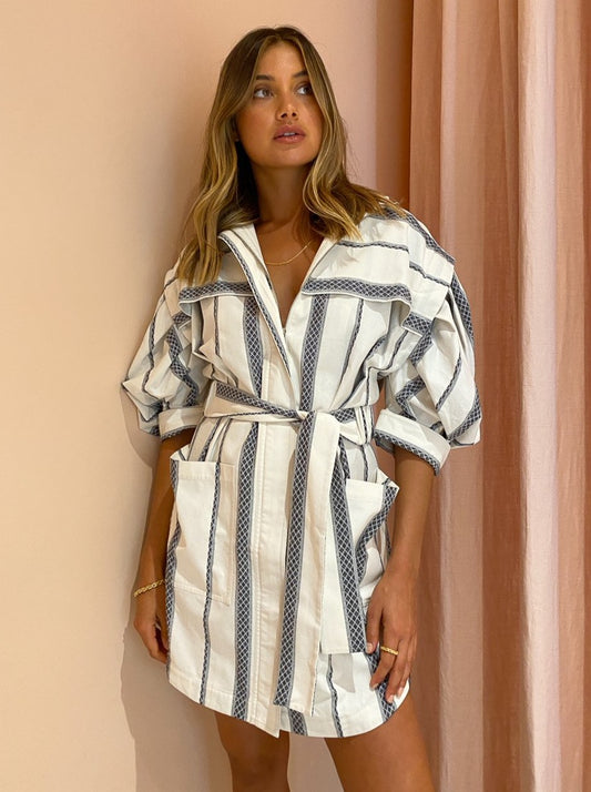 Designed in a ink stripped cotton, this mini shirt dress features exaggerated sleeves, front pockets and a waist tie.