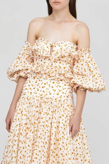 - Off the shoulder crop top with puff sleeves and gathered layered frill detail