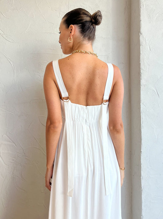 Featuring midi length, adjustable D-ring straps, square neckline, and gold hardware, this stylish design is crafted from a linen blended fabrication with ruching across the bodice, a centre cut out, tiered construction and an invisible back zip.