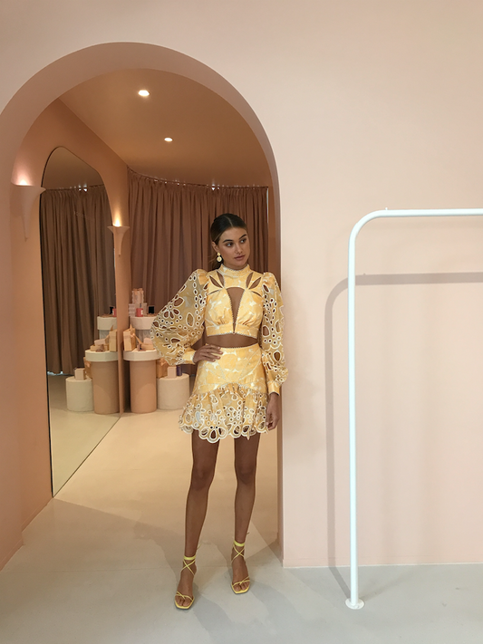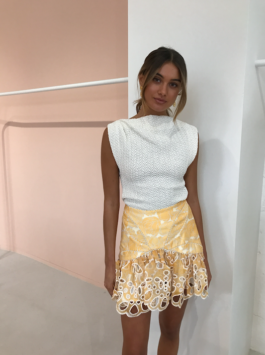 The Acler Meredith skirt is a delicate embroidered mini skirt with ruffled hemline. Wear with a simple cami or the matching Meredith blouse.