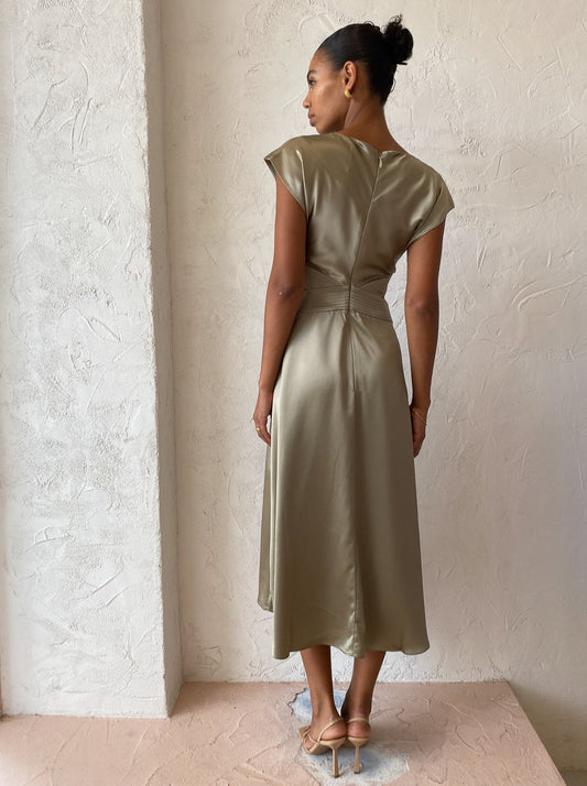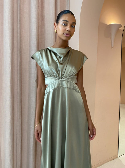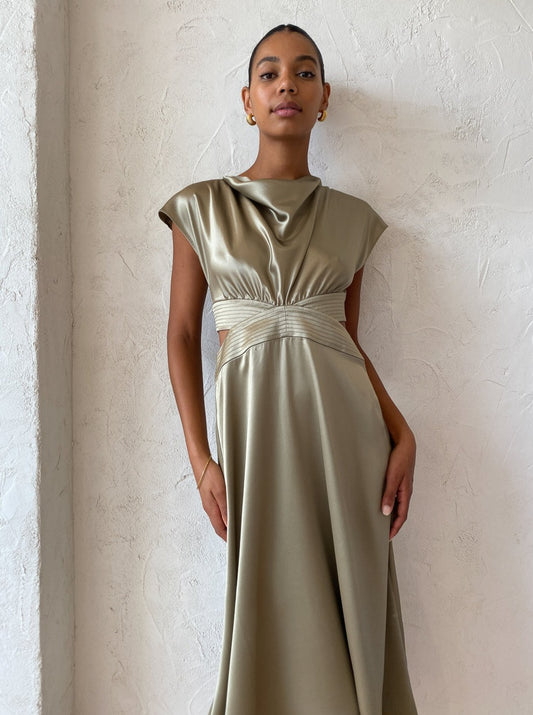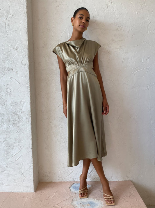 Crafted from a soft touch fabrication, this midi dress sits fitted at the waist and relaxed throughout. Featuring a high neckline detailed with a soft cowl and cut out detail at the waist with gathered fabrication.