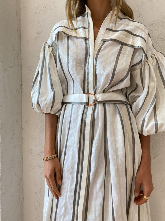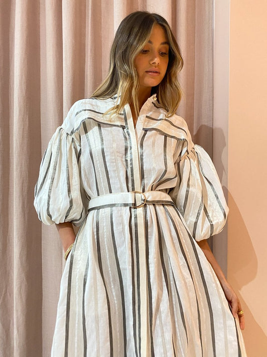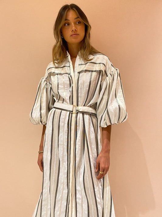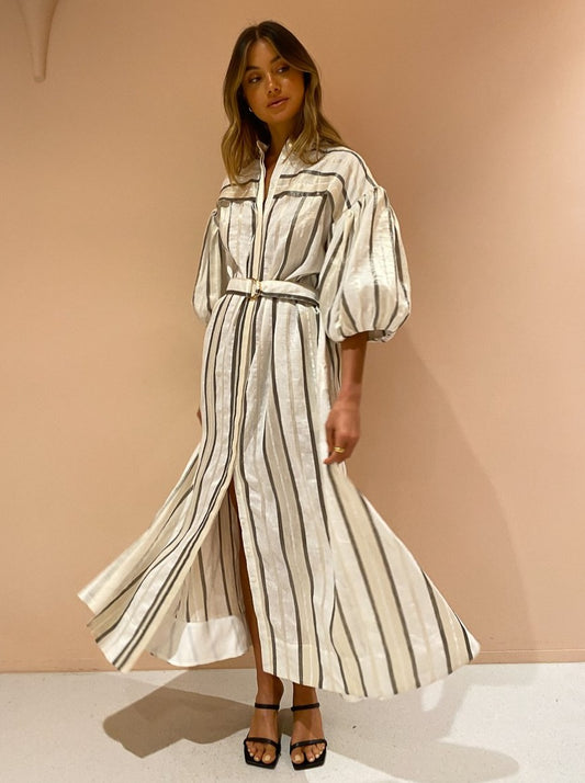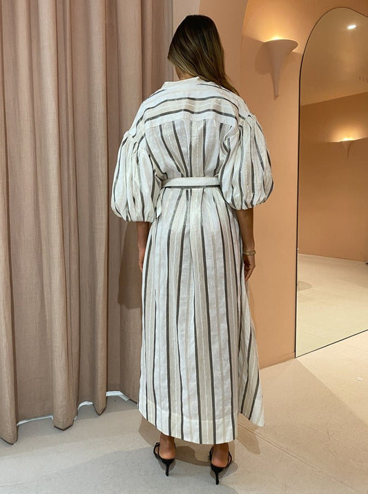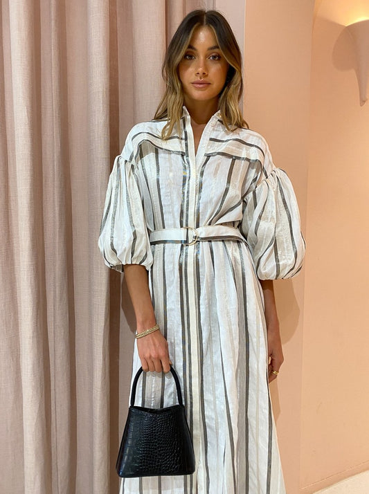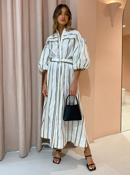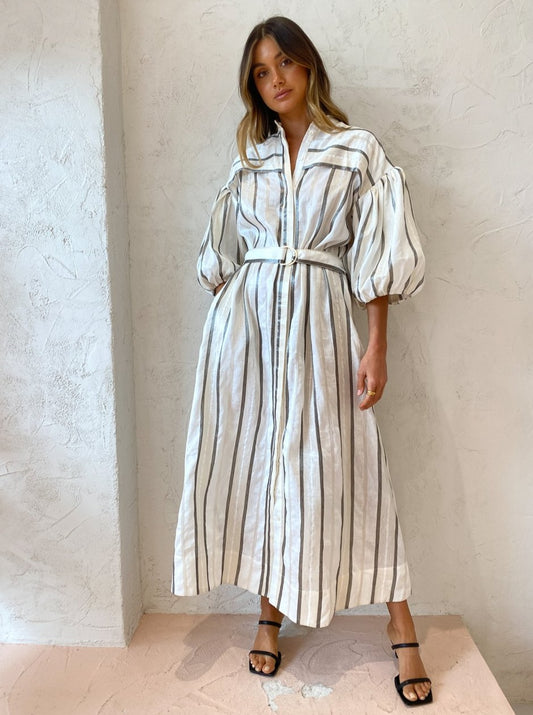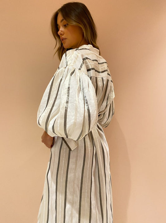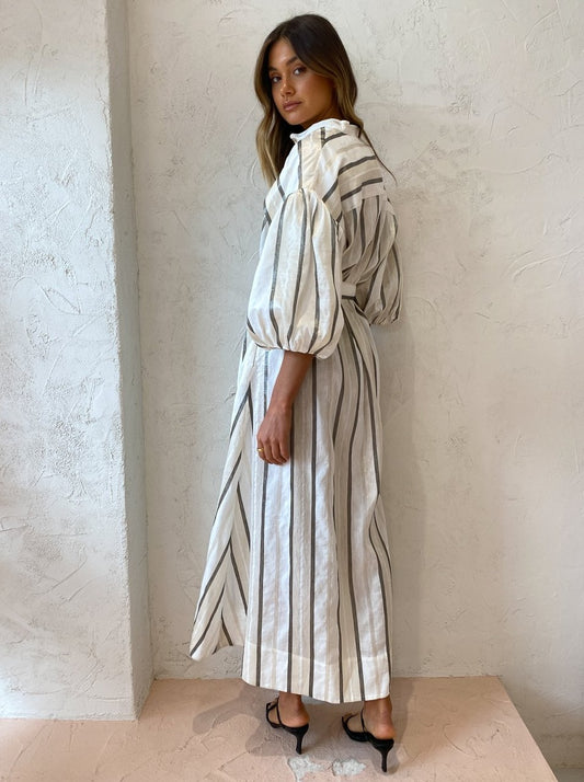 With the signature blouson sleeves and tonal stripe, this maxi dress will be the perfect pairing for festive celebrations, long lunches and desk to dusk occasions.