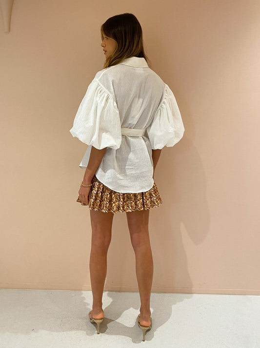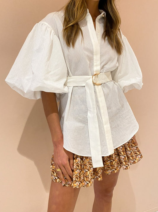 Elevating the top with it's dramatic balloon sleeves, this shirt will see you through those desk to dusk days.