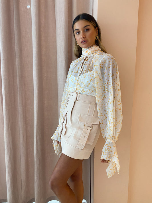 Designed with the Coco girl in mind, this fun at heart mini skirt blends utilitarian styling with pale pink perfection for weekend getaways through to cocktail hour.