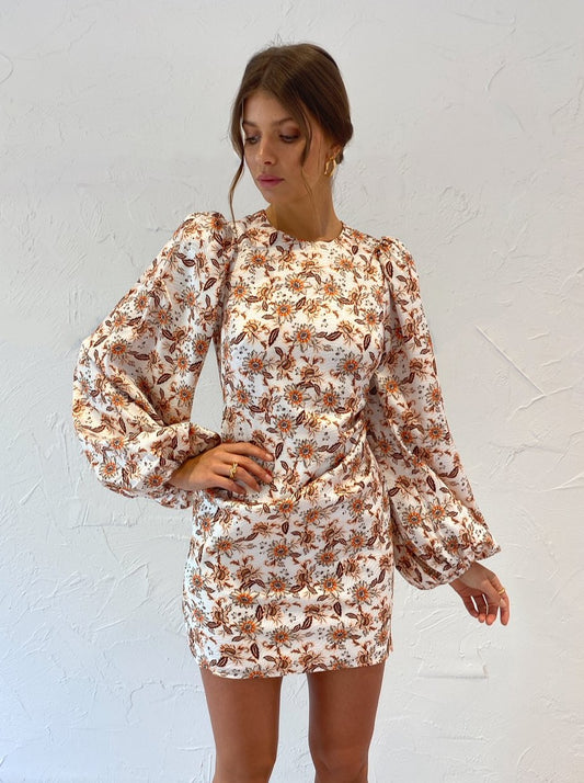 Crafted from a lustrous fabric and exclusive floral print, this dress features exaggerated sleeves and a modest neckline.