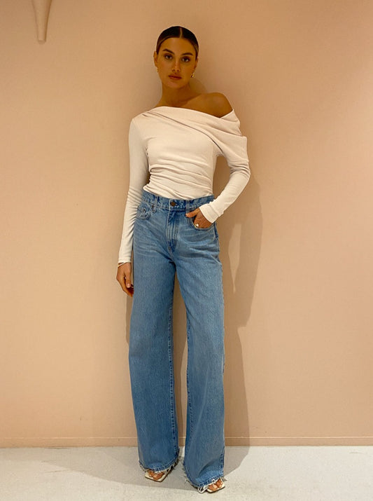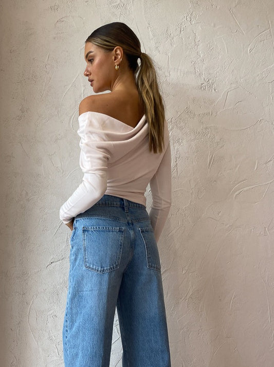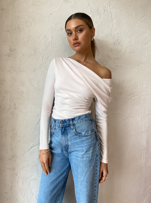 Crafted from a soft blush modal fabric, this long sleeve top is designed to sit fitted at the bodice. Featuring a drop shoulder, asymmetric neckline and gathered detailing across the chest.