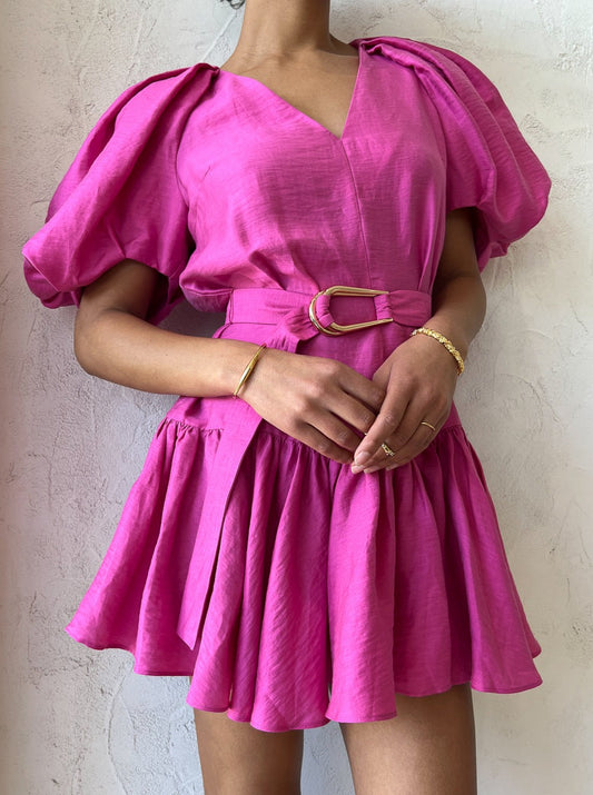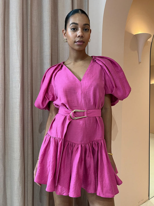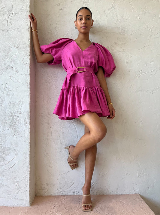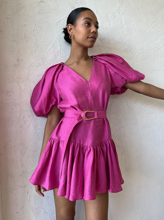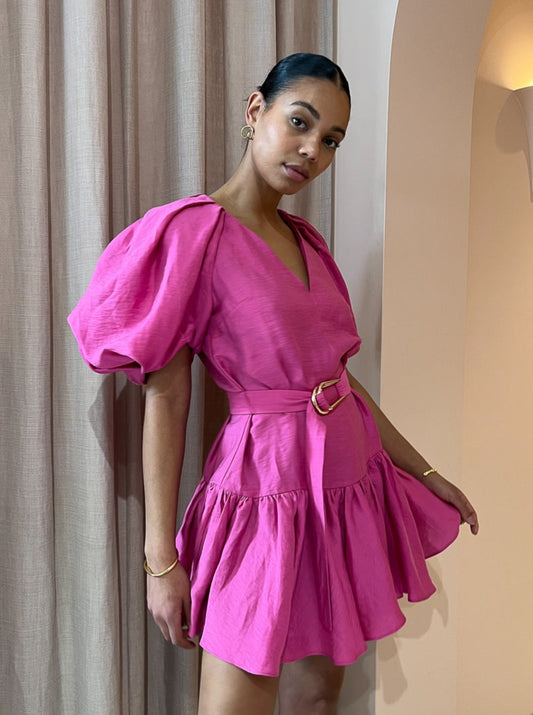Crafted from a soft Linen blend fabrication in a bold Flamingo Pink hue. This mini moment embodies quintessential Acler design sensibilities with a structured V neckline, soft balloon sleeves and a tapered waist before falling into a playful mini skirt with gentle gathers.