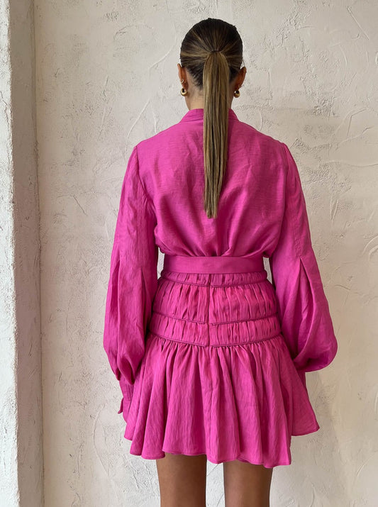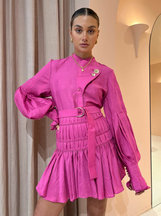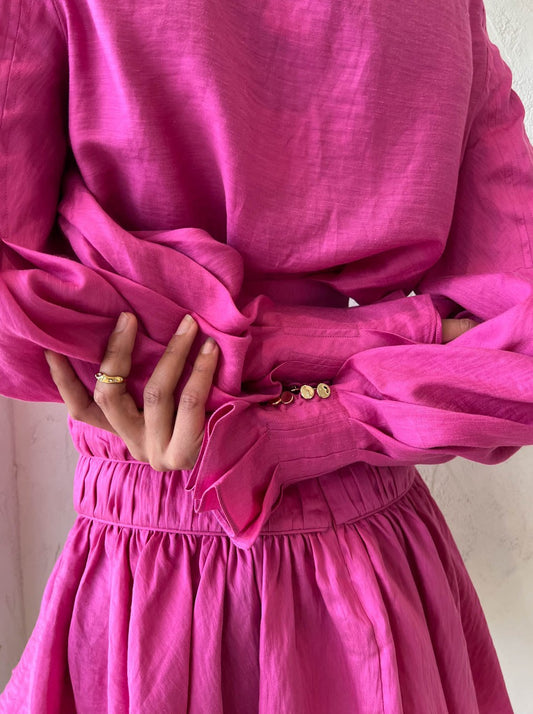 Crafted from a lightweight linen blend in bold Flamingo Pink. This contemporary blouse sits relaxed on the body with a decadent grandfather collar, a concealed placket and long blouson sleeves with panel detailing and gathers throughout.