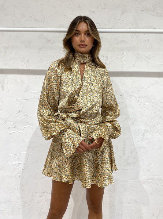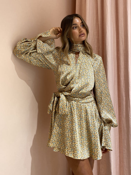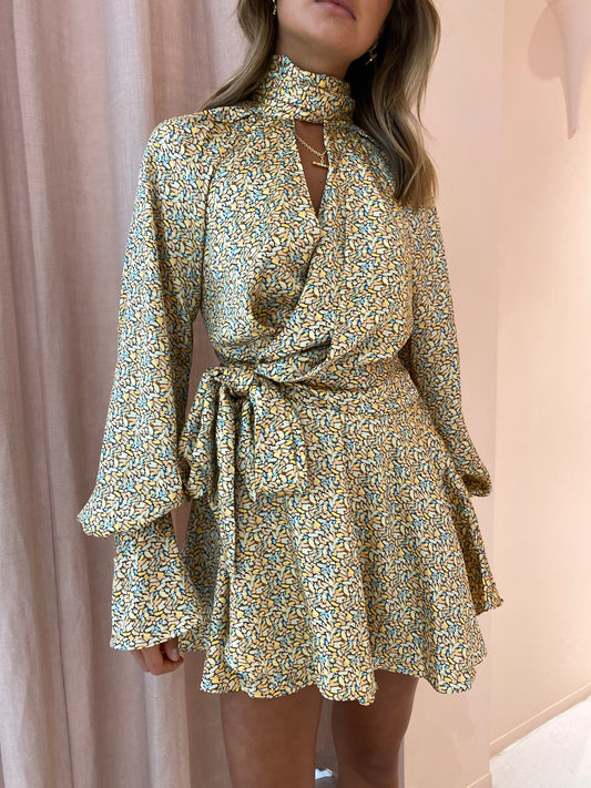 The pastel brushstroke print on a soft satin feel fabric, is complimented by the draped wrap style silhouette and draped neck tie.