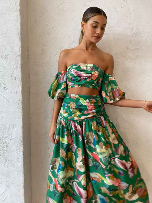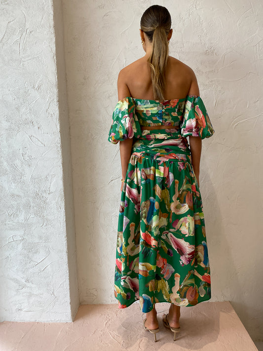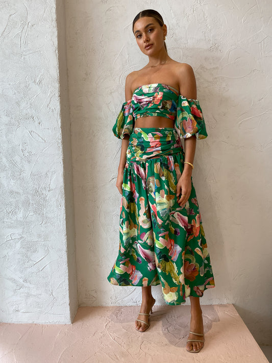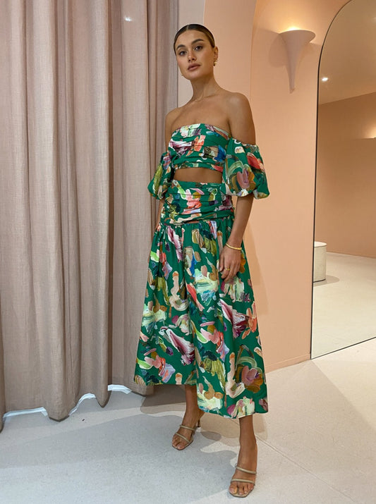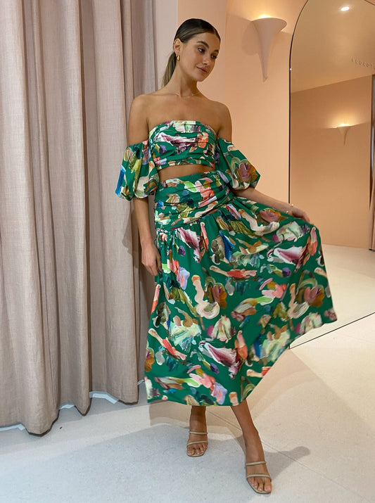 Alemais' Arlo Midi Skirt in Forrest adds a vibrant infusion of colour to any Coco occasion closet.