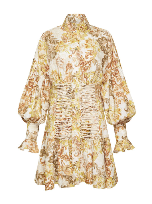 Beauty is reflected in every element of this detailed silhouette. Fitting true to size as a shirt dress with featured intricate rope corset detailing, the Bernadette Mini has a high neckline, shell button detailing on the blouson sleeve cuffs and front placket.