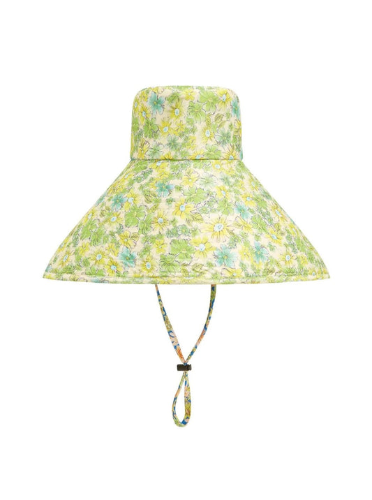 Crafted from a crisp Cotton Canvas in Alemais Daisy floral print, its an exaggerated wide brim hat with top stitching along the brim and a toggle string fastener.