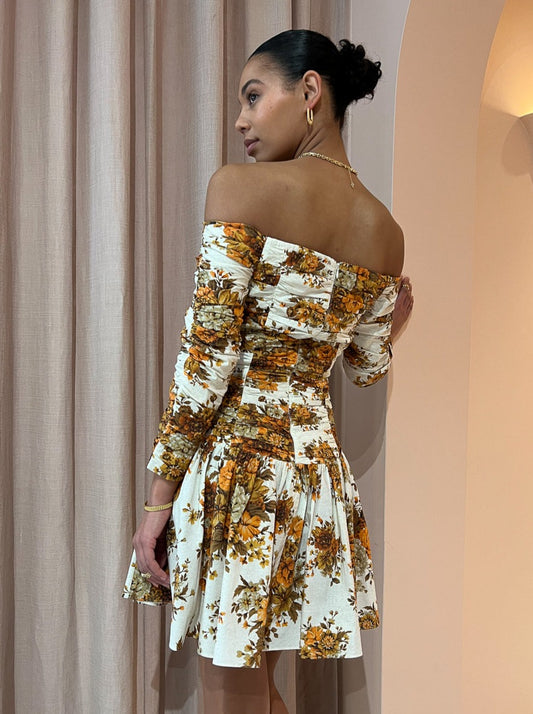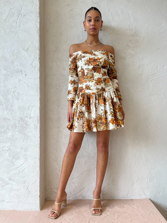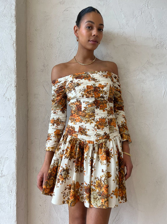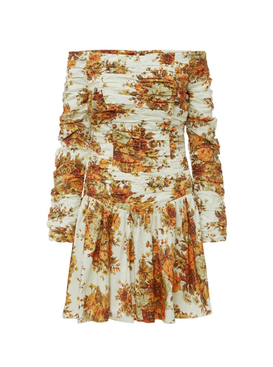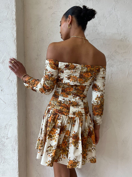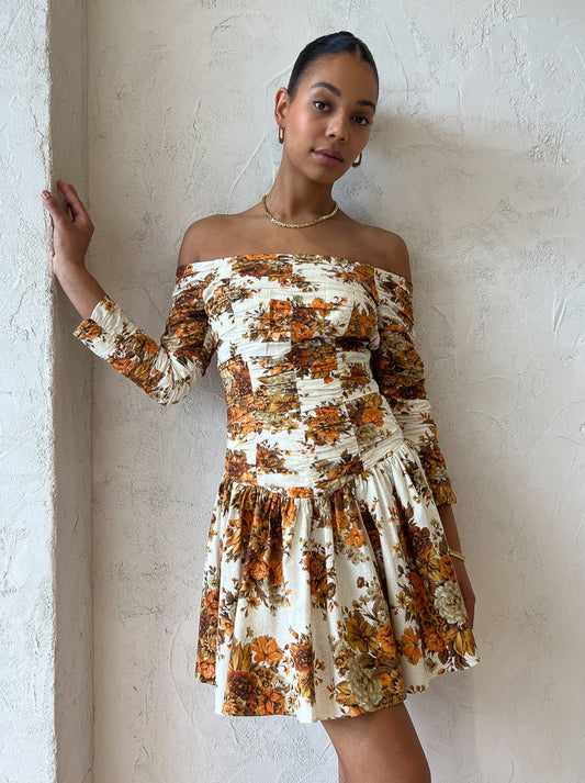Delicately crafted from a cotton poplin fabrication this vintage inspired mini dress is printed with autumnal florals. With a flattering off the shoulder straight neckline it sits fitted through the body, featuring horizontal gathered details on the bodice and long sleeves.