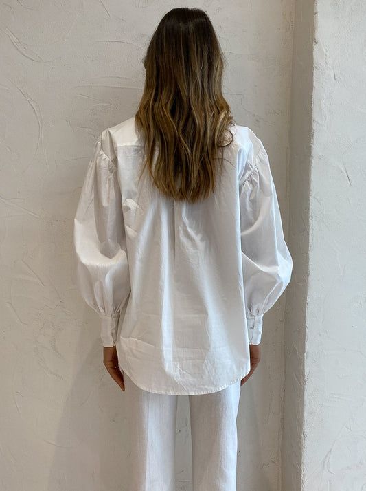 This fun at heart poet inspired shirt is crafted from a 100% organic Cotton Poplin fabrication and features a traditional collar, blouson sleeves and button fastening down the centre front. Designed to fit relaxed on the body, this shirt is a playful conversational piece for you to style your way.