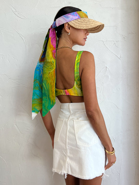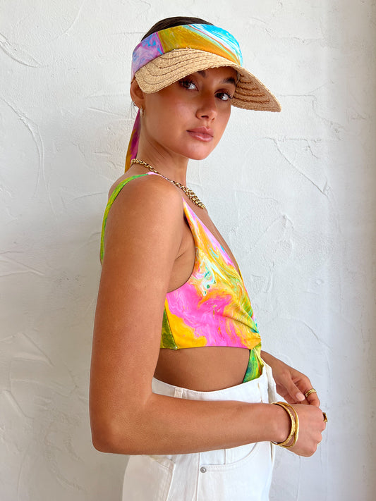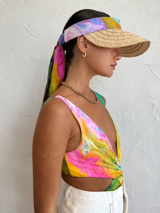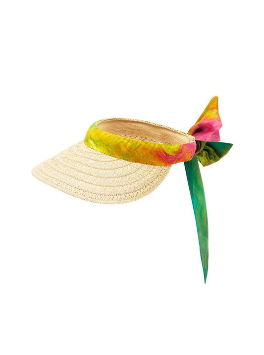 Crafted from a hand braided Raffia trim, the Straw Visor fastens at the back with exaggerated ties that are elevated with exotic bleeds of colour.