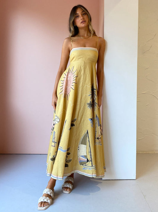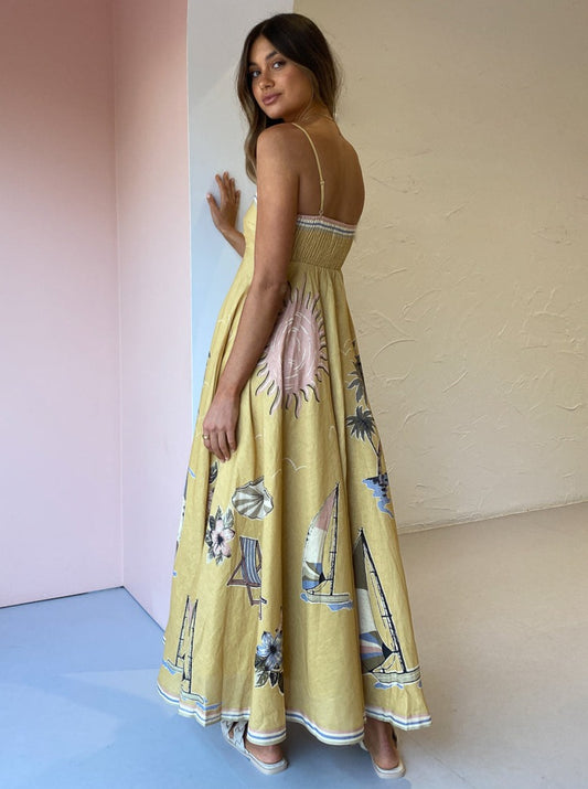 Crafted from a Linen fabrication in sunshine yellow, this sundress is designed to fit relaxed on the body for comfort and ease of wear. Featuring a square neckline and empire waist which falls into a free flowing full skirt that finishes at the ankles.