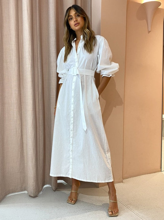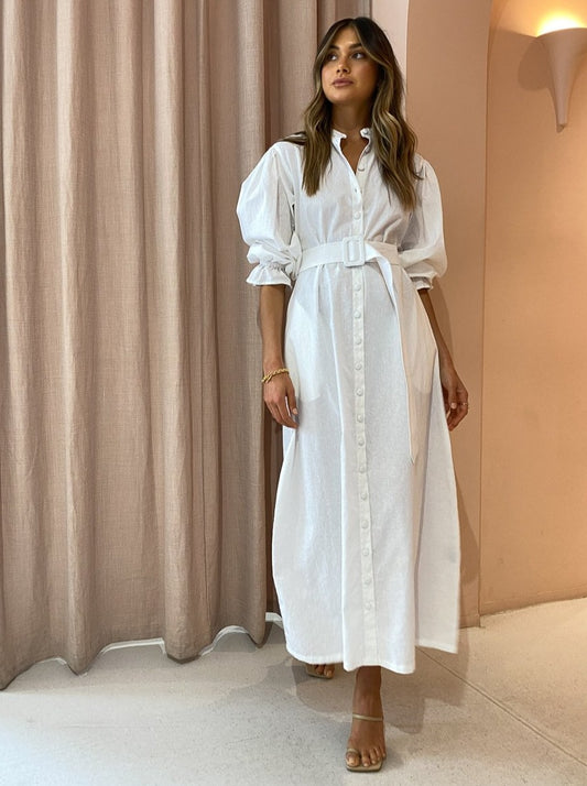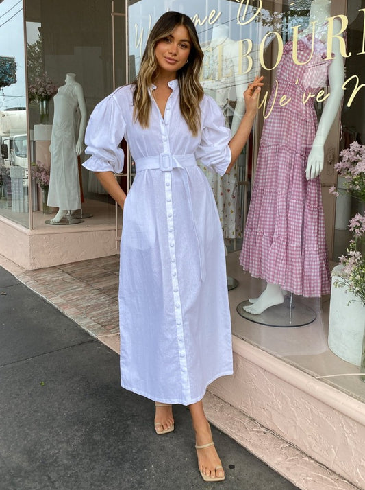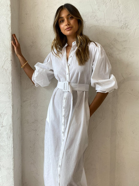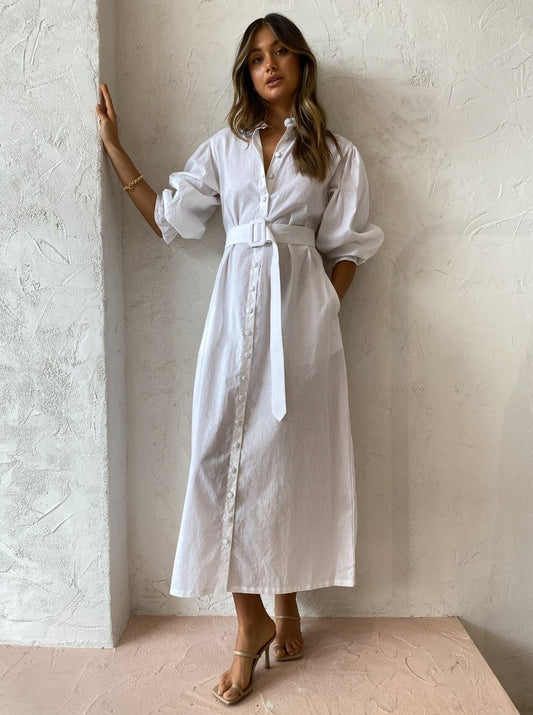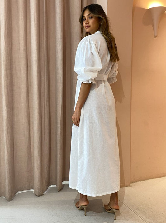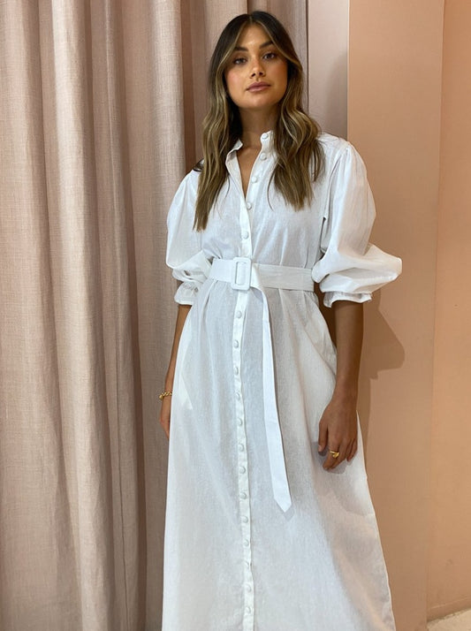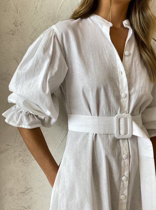 Designed to form and flatter, this midi dress is crafted from a Cotton Linen blend fabrication and features a collar, long elasticated sleeves, a button down front and a detachable belt to subtly cinch and accentuate the femme figure.