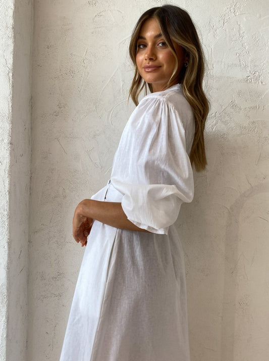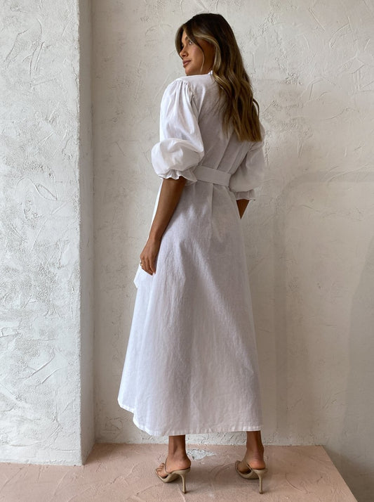 Refresh your desk to dusk wardrobe with Ambra Maddalena's timeless Raphaella Dress in White.