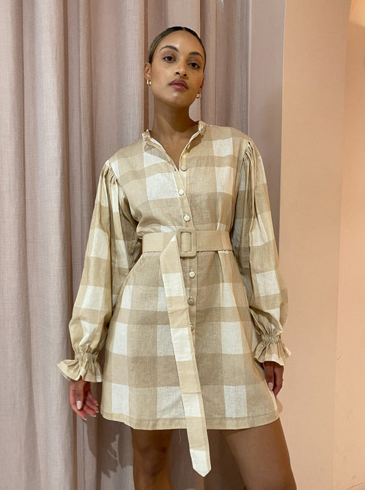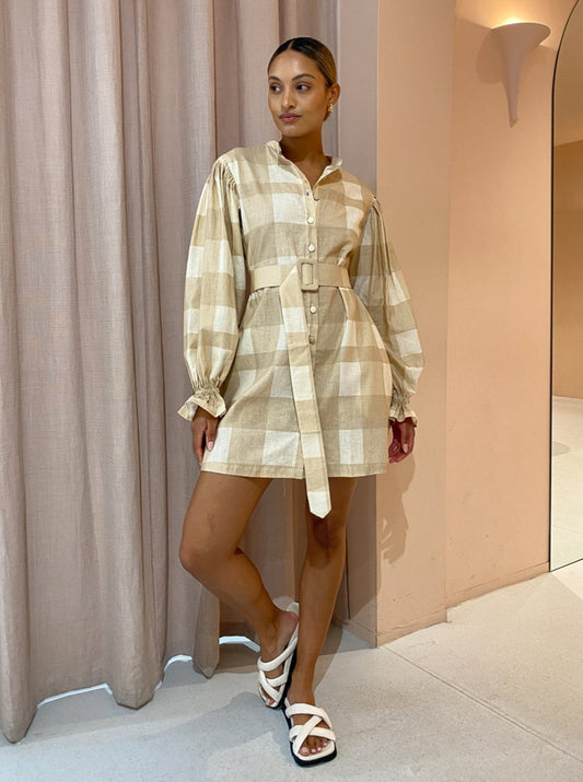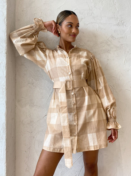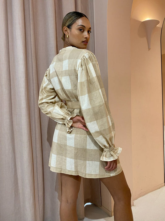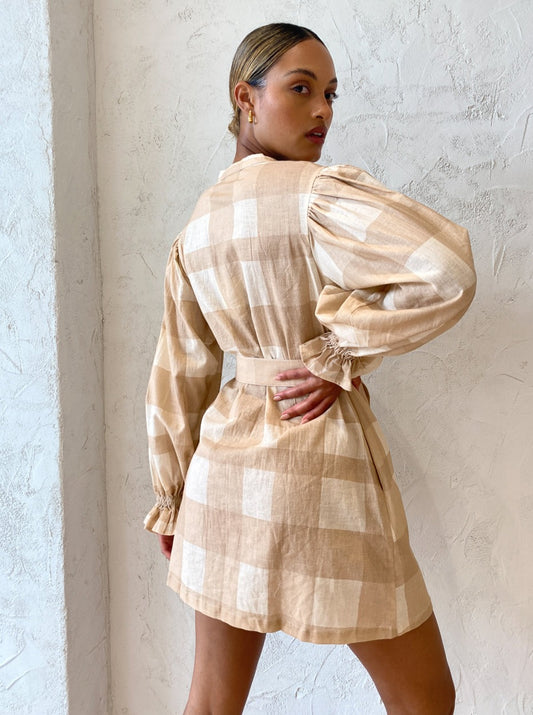 Update your trans-seasonal mini dress repertoire with the tonal and structured Sammi Smock Dress in Coffee Checkers by Ambra Maddalena.