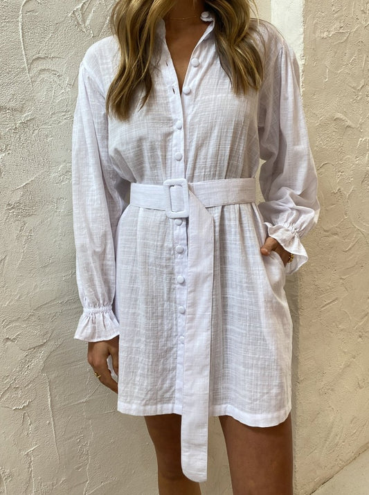 Crafted from a Linen fabrication, this mini smock dress features a collar, billowing sleeved with elasticated wrists with ties, side seam pockets and a detachable belt to subtly cinch and accentuate the femme form.