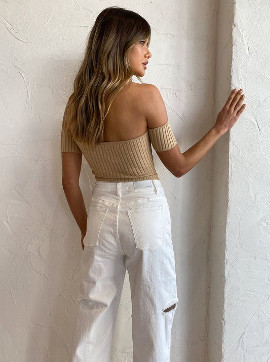 Crafted from a soft Cotton elastane blend rib knit, this off-the-shoulder top with short sleeves and form fitting design effortlessly hugs and contours the body.