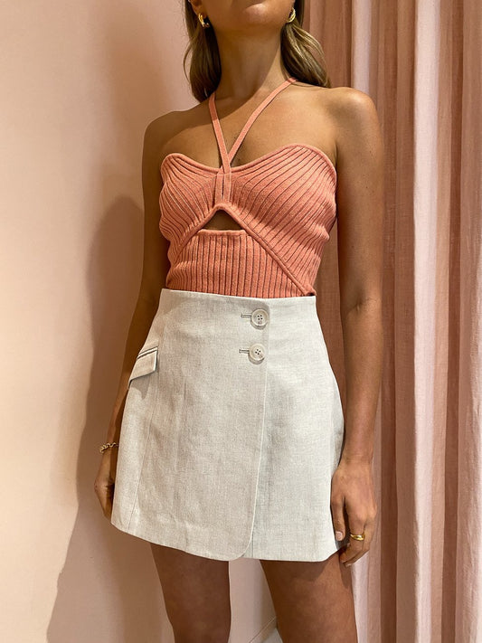 Crafted from a soft Cotton blend fabrication, this sleeveless knit rib top features a fixed halter style neckline with spaghetti straps and a cut out detail under the bust. Designed to hug the sit fitted on the body to flatter and form effortlessly.