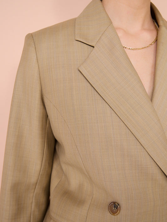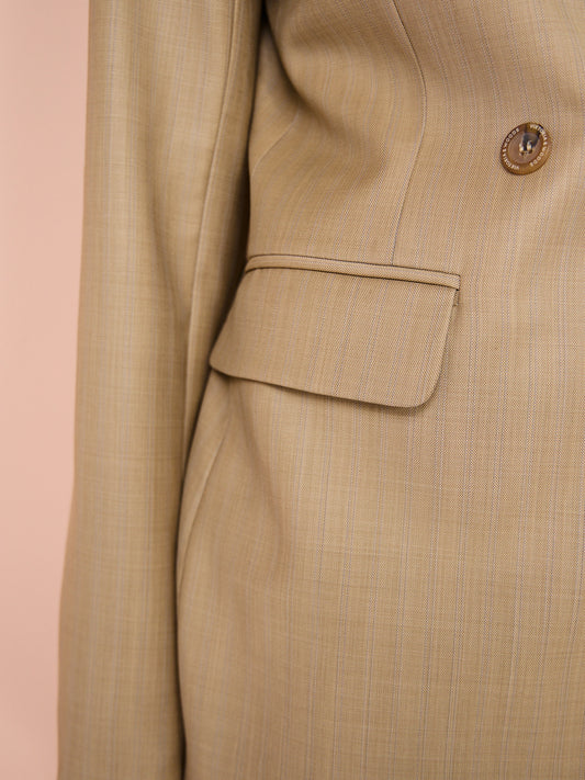 Styled with double-breasted notched lapels, princess seams, and flap pockets, this blazer is an investment piece for your wardrobe. Its faux tortoise logo buttons, sleeve buttons, and back vent ensure a timeless look.