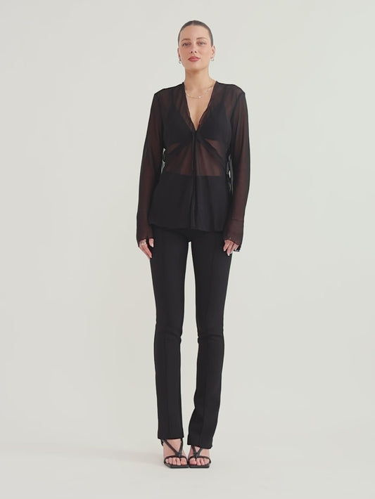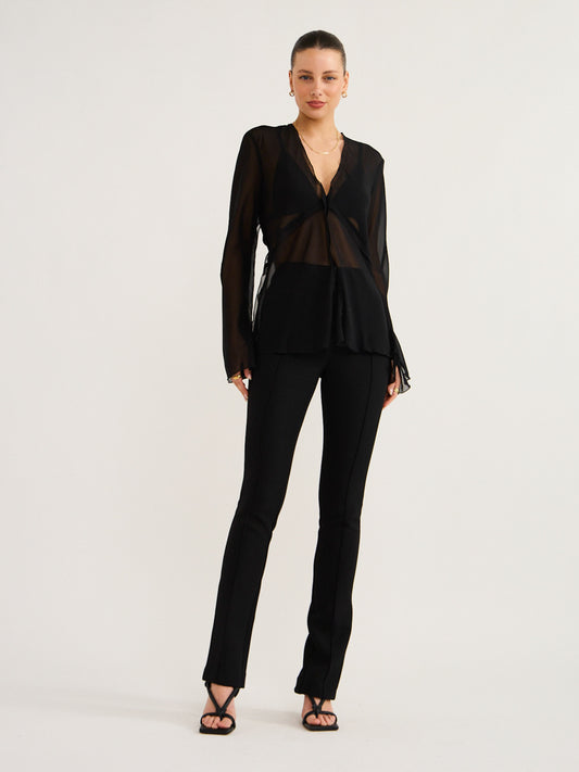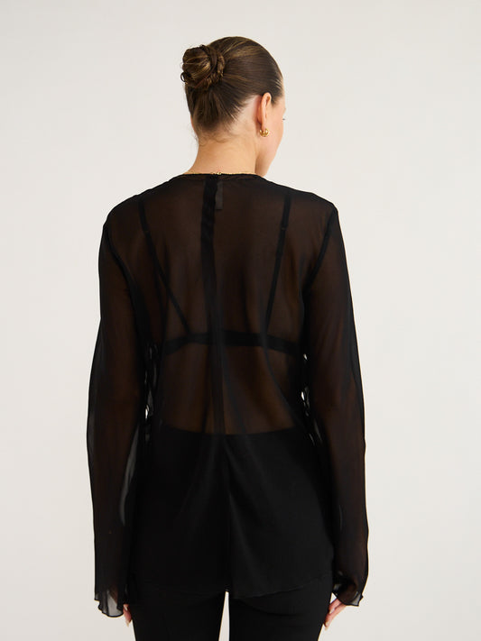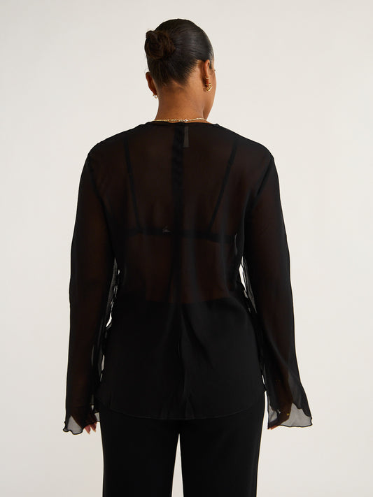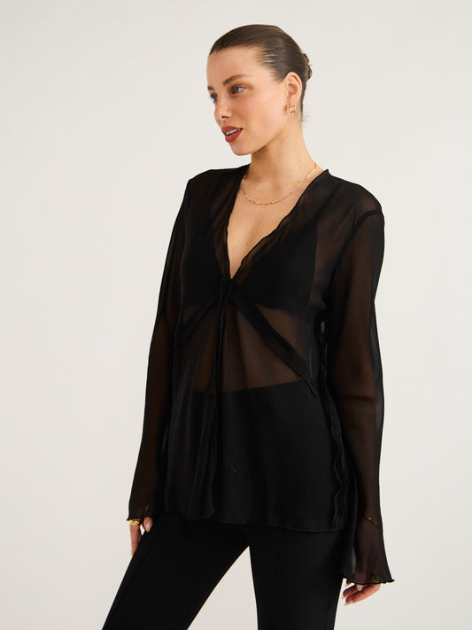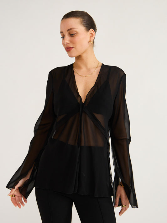 Crafted from a sheer silk fabrication, this blouse features a V-neckline and flared sleeves with subtle splits, to create a captivating silhouette.
