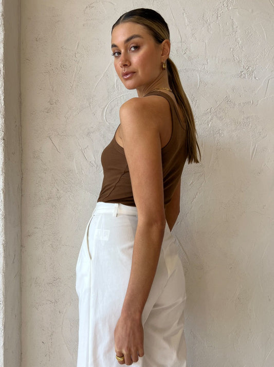 Invest tonal wardrobe essentials with Assembly Label's Ciel Organic Rib Tank in Burnt Ochre.