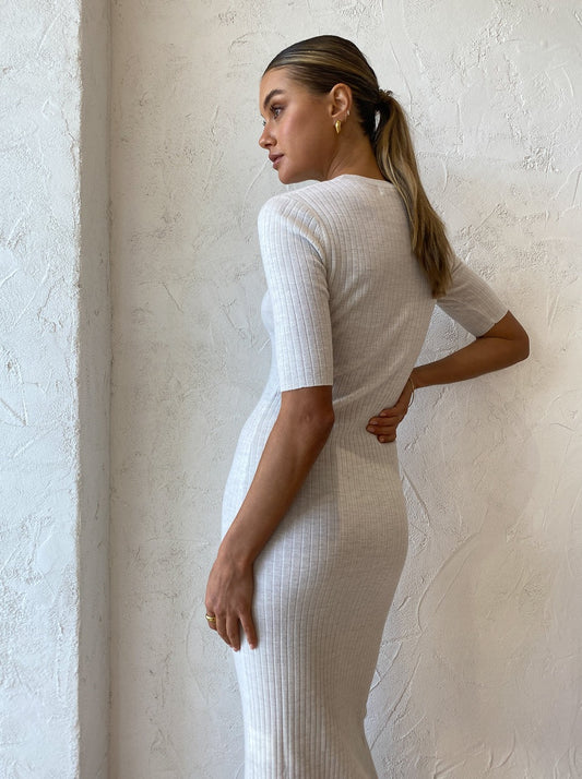 Crafted from a soft Merino Wool, the Ella Dress is designed comfortably hug the femme bod in all the right places. Featuring a crew neckline, short midi length sleeves and a calve skimming hemline.