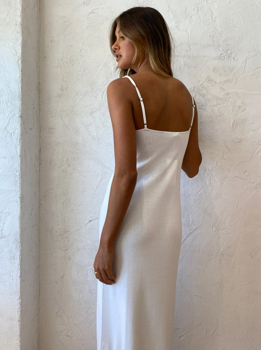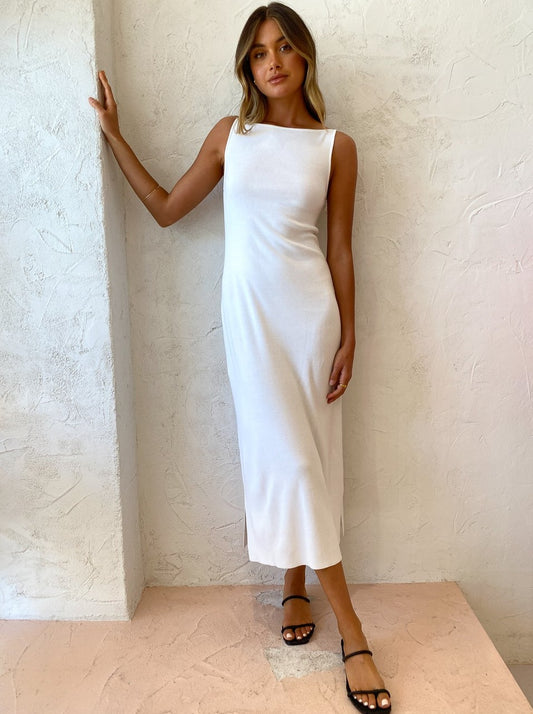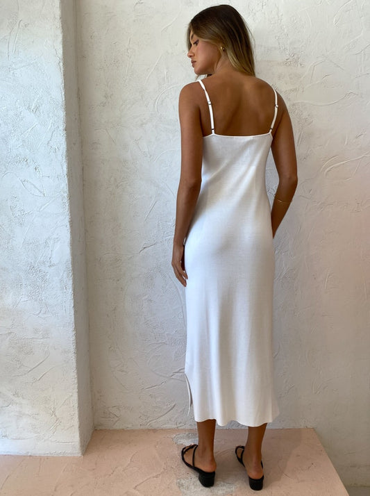 Designed to fit and flatter the femme silhouette, this midi moment is crafted from a lightweight knitted Cotton Modal blend in a neutral White hue. A sleeveless style, it's cut with a boat neckline, adjustable slim straps and side split hemline.