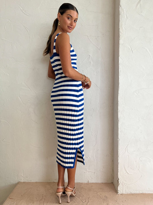 Effortlessly understated, the Clementine Dress in Sapphire/Coconut from Aston Studio adds a timeless stripe to any occasion.