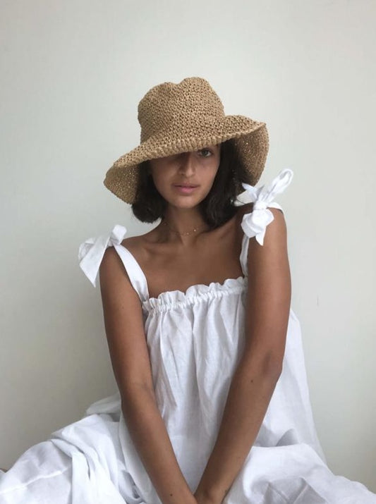 A handmade piece, designed with sustainably sourced paper straw and featuring a soft brim that can be worn up or down.