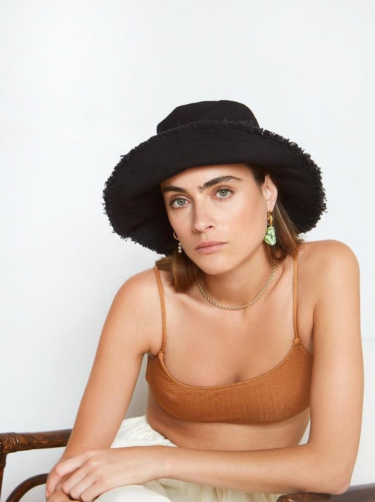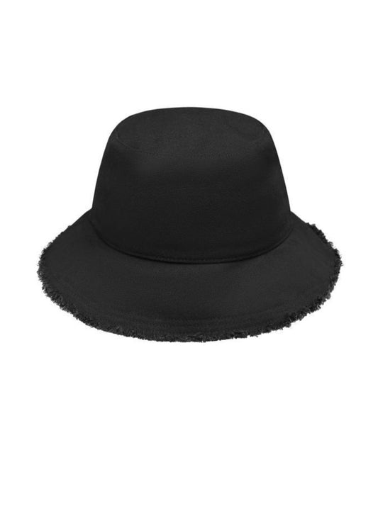 Crafted in a black organic canvas cotton with a frayed edge, this takes a modern take on your traditional bucket hat.