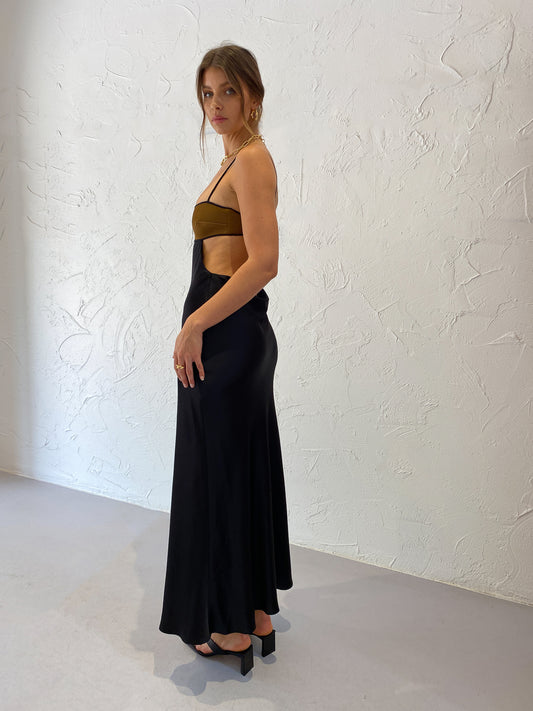 Crafted in a stunning two tone black and copper fabrication, this midi features a bandeau style bodice with plunging cowl back and cut out detail.