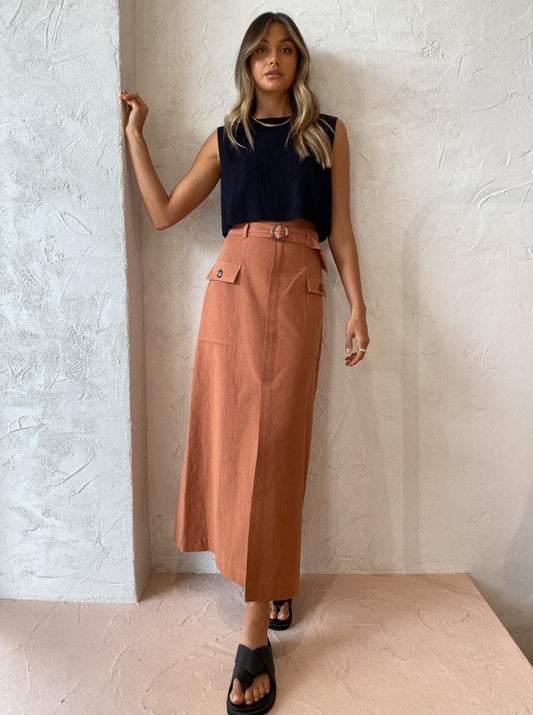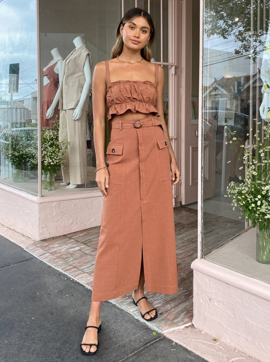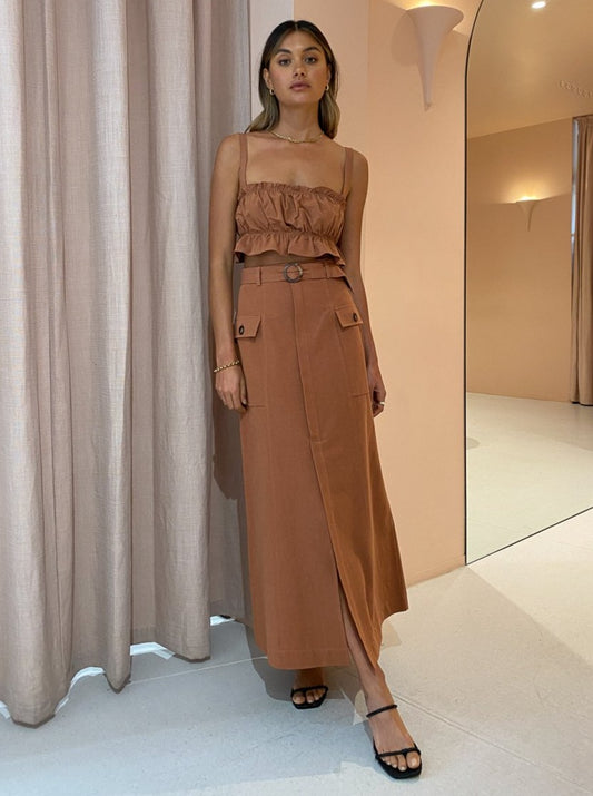 The Arizona Maxi Skirt in Terracotta by Bec + Bridge has us loving Safari inspired dressing in rich earthy hues.