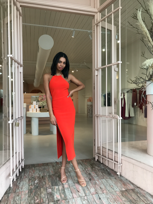 A signature Bec and Bridge bonded crepe midi dress with back detail.